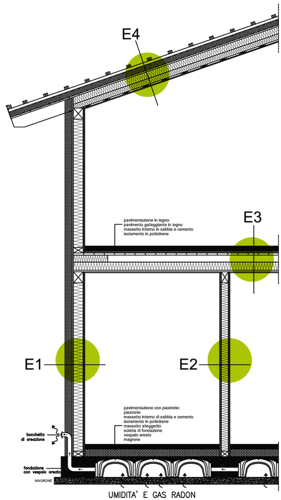 | Sezione della parete esterna ECO (U=0,17 W/m2K): (composizione vista dall’esterno verso l’interno) 3 mm intonaco decorativo 3 mm malta con rete 100 mm pannelli in polistirene 16 mm lastra in legno cemento 140 mm intelaiatura in legno (massiccio o lamellare) 140 mm isolamento in lana di roccia 12 mm lastra in legno cemento 0,25 mm foglio PE 12,5 mm lastra di cartongesso |