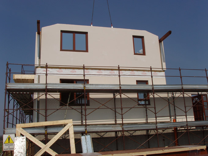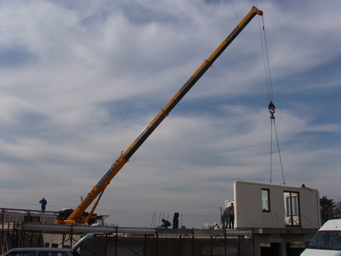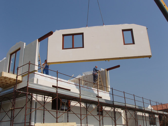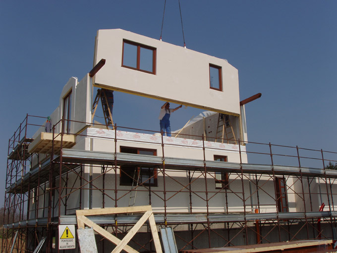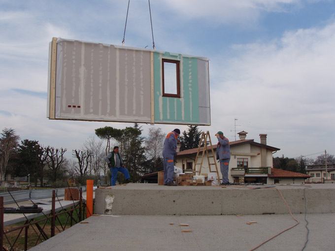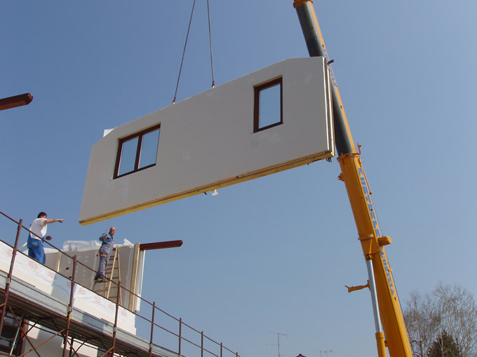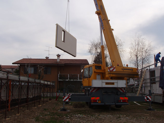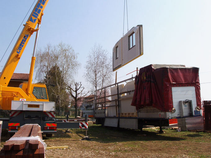 Gli elementi prefabbricati vengono consegnati in cantiere con autocarri e scaricati per mezzo di autogrù. I pannelli delle pareti sono completi di serramenti e predisposti per gli impianti elettrici. Dopo aver livellato il basamento si può procedere con il montaggio della casa.