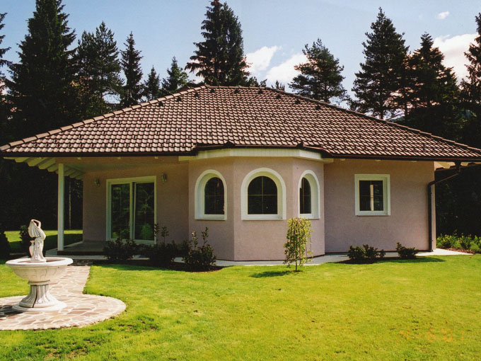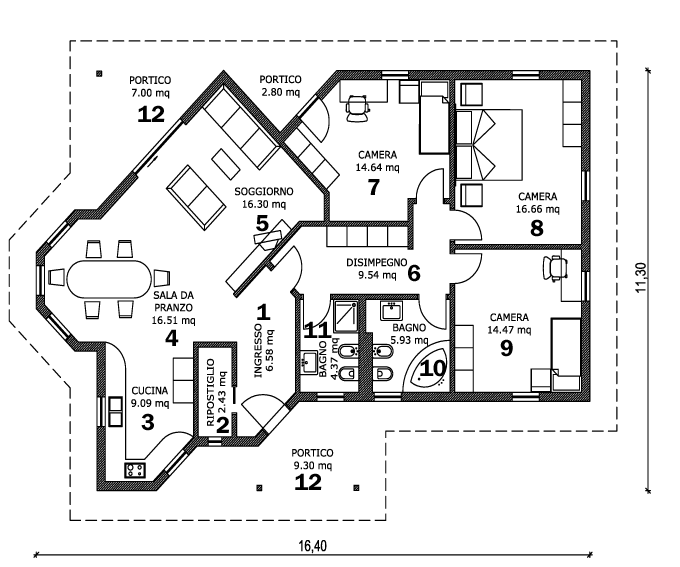 In stile mediterraneo e a pianta irregolare, ideale per una famiglia di 4 persone, che ama vivere su un unico piano a contatto diretto con la natura.Misure esterne del fabbricato: