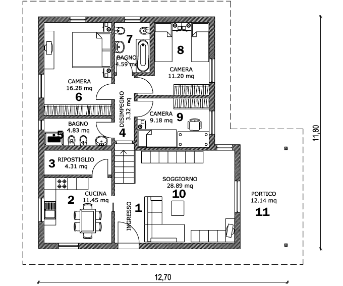 La casa si sviluppa su piani sfalsati per creare una netta separazione tra la zona notte e la zona giorno.Misure esterne del fabbricato: