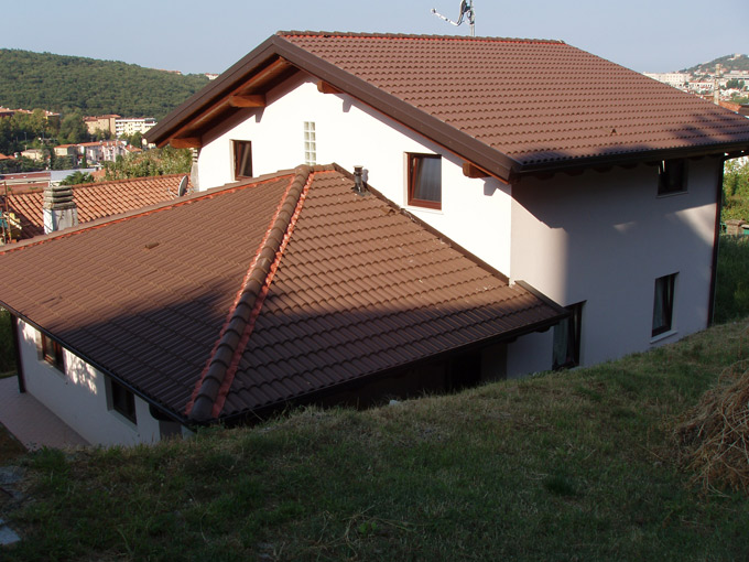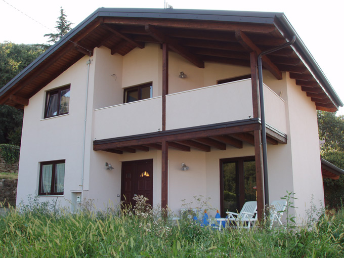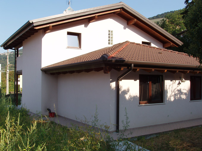Casa unifamiliare confortevole con pianta irregolare, ampio terrazzo, portico e tetti a più livelli. La particolarità è il legno a vista.Misure esterne del fabbricato:
